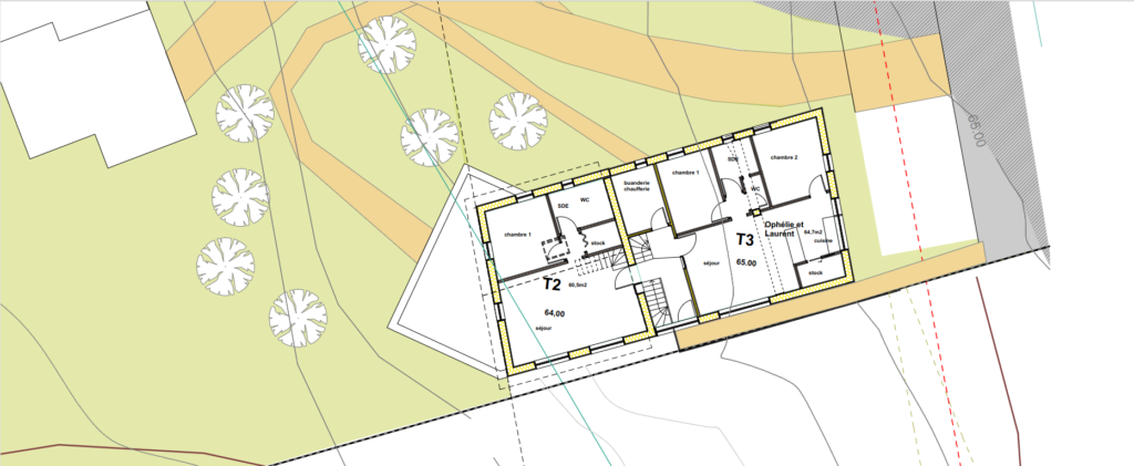 Le logement concerne un T2 avec terrasse, 1er étage de 55 m2, accessible à tous. Nous avons prévu chaque logement avec chambre, cuisine, salle de bain, pièce de vie et surtout des parties communes : buanderie, jardin, atelier, chambre d’ami.e.s, cuisine, salle de vie.